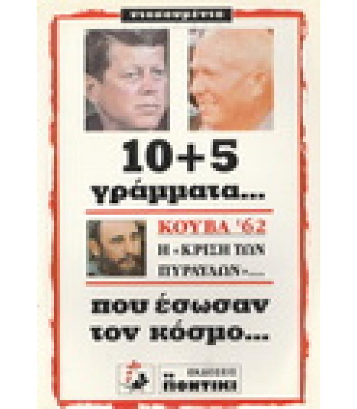 Το 10 + 5 Γράμματα Που Έσωσαν Τον Κόσμο – Κούβα 62, Η Κρίση Των Πυραύλων αφηγείται τα κρίσιμα γεγονότα του Οκτωβρίου του 1962, όταν οι ΗΠΑ και η Σοβιετική Ένωση βρέθηκαν στο χείλος πυρηνικού πολέμου εξαιτίας της εγκατάστασης σοβιετικών πυραύλων με πυρηνικές κεφαλές στην Κούβα. Μέσα από επιστολές, διεθνή μηνύματα και διπλωματικές ανταλλαγές, το βιβλίο παρουσιάζει πώς οι ηγέτες των δύο υπερδυνάμεων κατάφεραν τελικά να αποτρέψουν την καταστροφή, προσφέροντας μια ζωντανή και ντοκουμέντο-βαθιά ματιά σε μια από τις πλέον κρίσιμες στιγμές του Ψυχρού Πολέμου.